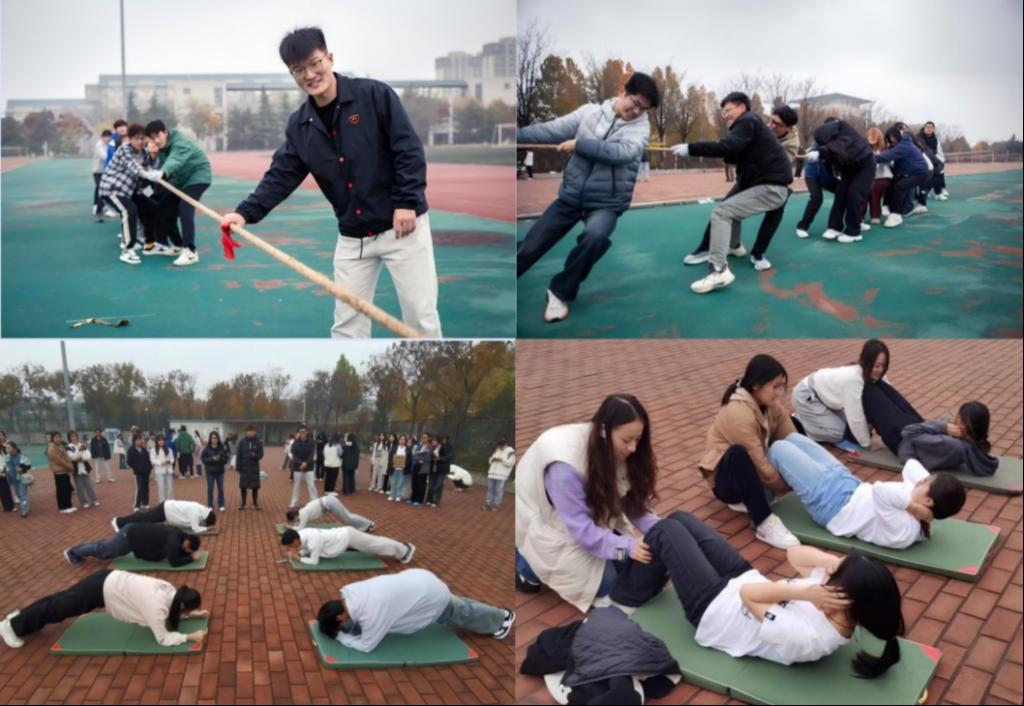 “国贸之健,热血青春”项目比拼环节,同学们在仰卧起坐、俯卧撑和平板支撑项目中挑战极限,超越自我。团体赛拔河时,大家齐心协力,为班级荣誉呐喊拼搏。