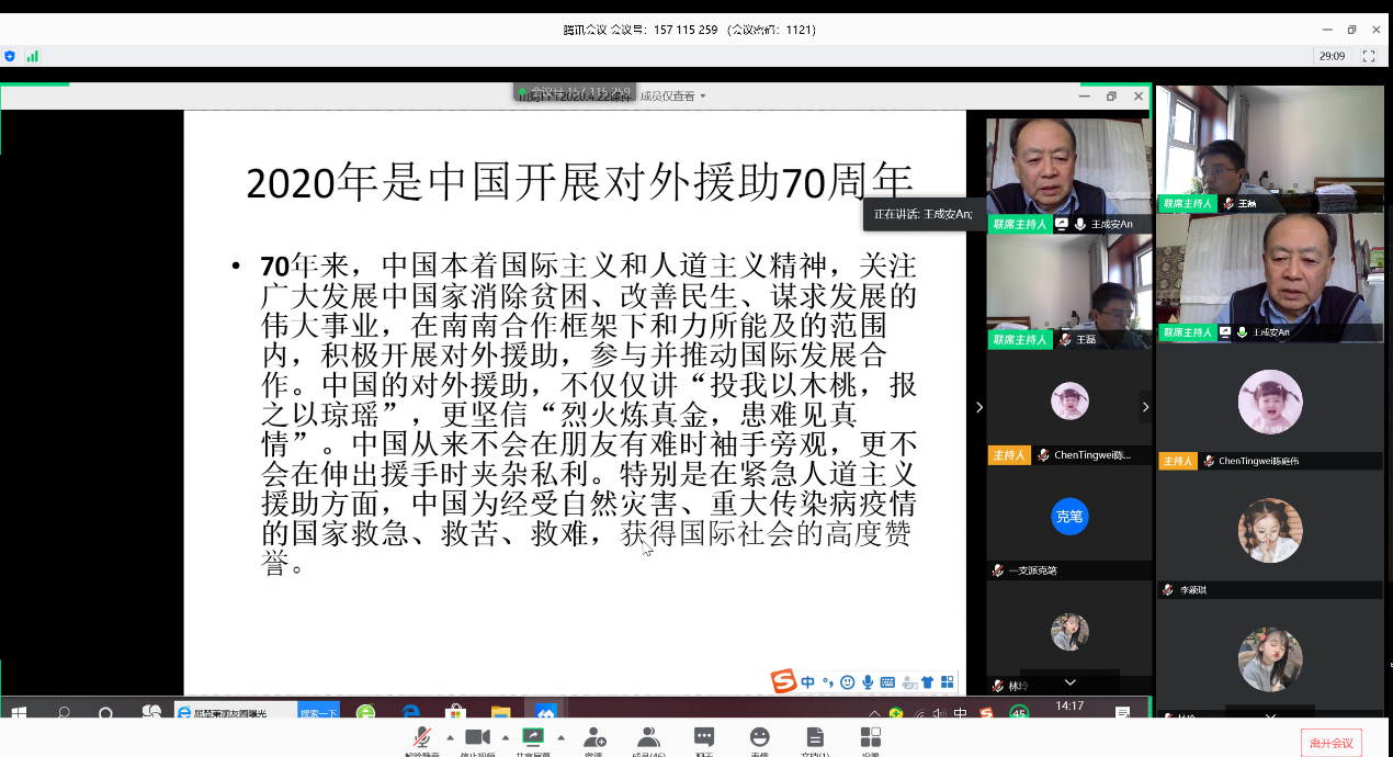4月23日下午,商务部援外司原副司长、资深翻译家、我校顾问教授王成安先生应邀为我校国际发展合作本科创新实验班和研究生创新实验班的同学们作线上授课。