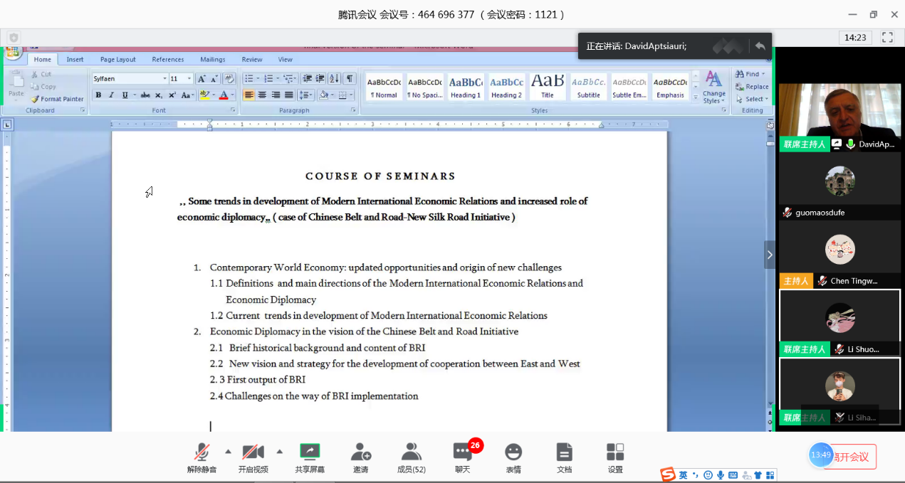 44-18日,格鲁吉亚前驻华大使大卫阿普恰乌利(David Aptsiauri)先生在其位于格鲁吉亚首都第比利斯的家中,应邀为蜜桃视频 国际发展合作本科创新实验班和研究生创新实验班的同学们作线上授课。他基于经济关系与经济外交的内涵、一带一路实践案例的范式指导、现代国际经济关系发展的新趋势、当前经济外交的挑战及国际商业文化差异等模块,为学生们设计并讲授了国际经济关系与经济外交系列课程。