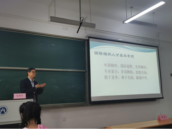 马燕生先生曾长期任职于联合国,具有丰富的国际组织工作经验。讲座中,他从国际组织的分类、国际职员的工作性质、国际组织的治理结构等多方面系统阐述了国际组织的特点和最新发展情况,并结合我国现状,围绕中国参与国际组织面临的困难和挑战展开讨论,进而引出我国在国际组织中的人才极度匮乏问题。马公参提到,虽然我们中国人口数量众多,但在国际组织中的任职人员比例却是长期处于低位的,尤其是多语种复合型专业人才非常匮乏,这对我国在国际舞台上的影响力和话语权提升都有显著影响。在这一背景下,他认为我校国际发展合作创新班的组建非常必要,相关人才培养是国家软实力提升的重要组成部分,当前国家对国际组织人才培养的重要性和紧迫性已经上升到战略高度,我校作为全国第一批正式创办对应专业创新班的高校,对我国新时期国际化涉外人才培养事业发展意义重大。在讲座最后,他从国际组织人才所需要的四个素质和四种能力,即政治素质、专业素质、知识素养、个人素养和外语应用能力、交流沟通能力、统筹协调能力、分析研判能力等方面,向同学们阐述了大家最为关心的个人学习和成长发展问题。他勉励大家,要具备中国情怀、国际视野和世界胸怀,培养自己的专业复合、多语熟练、善于交流和融通中外的能力,为祖国的发展贡献自己的力量。