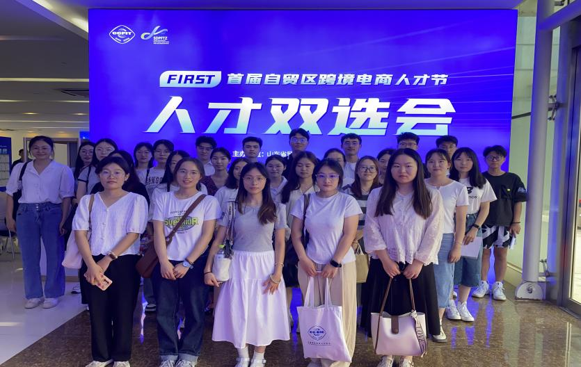 50余名毕业班学生,在学院院长助理王磊、跨境电商教研室主任兼跨境国合党支部书记刘宁、学工办主任李亚莉三位老师的带领下参加由山东省贸促会、济南市贸促会和山东自贸试验区济南片区管委会联合主办,中国国际商会山东商会、山东跨境电商产业园、山东星耀亿丰科技集团有限公司共同承办的首届自贸区跨境电商人才节。