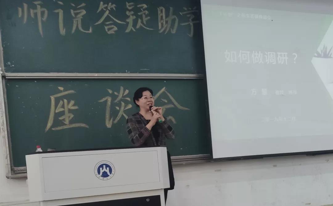 座谈会的第一环节是方慧老师就“如何做调研”这一讲题,为同学们带来了一场别开生面的解说。她先为同学们讲解了“三千计划”中三千的含义,即千村、千社区、千企业。作为我校的经验教师,方慧老师生动贴切的将同学们领进了科学调研的大门,首先,她为我们介绍了一个团队如何选题和设计调研方案,在会中方慧老师强调说,“一定要注意理论与实践的结合,不要空想,要落到实处去。”接着,方慧老师还就如何收集整理有效资料做了详细的讲解,对于调查问卷的设计及整理也为在场的同学们做了详细的解答。在座谈会中,方慧老师指出在研究阶段的主要任务就是整理资料、分析资料,她还将指导过的团队所得出的经验与同学们一同分享,在座的同学们都受益颇深。