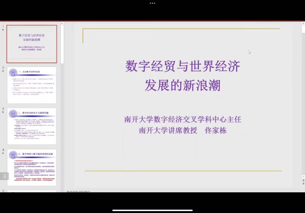 佟家栋校长以“数字经贸与世界经济发展的新浪潮”为题做主旨演讲,佟校长在报告中主要回答了面对当前的逆全球化对经济复苏和经济增长的严峻挑战,世界经济将走向何方?世界经济发展的新动能是什么?以数字要素加入为标志的数字经济与贸易将起到怎样的作用?等主要问题。他提出,数字经济将开启新一轮的经济增长,也将把世界经济引入一个全新的经济增长期这一观点。并特别强调了数字贸易的重要作用。数字贸易作为数字技术与贸易的深度融合,必将成为数字经济发展中的一个亮点。