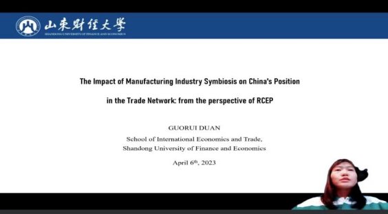 段国蕊副教授做了题为“The Impact of Manufacturing Industry Symbiosis on China's Position in the Trade Network: from the perspective of RCEP”(RCEP视角下制造业产业共生对中国在贸易网络中地位的影响研究)的报告。报告构建了竞争性、依存性和互补性三个维度的产业共生水平评价指标体系,并在RCEP框架内分析了其对中国在贸易网络中地位的影响机制和效果。结果显示,中国在RCEP贸易网络中地位不断提升但贸易集中化趋势加强;资本密集型和技术密集型产业内的贸易和分工会提升中国在贸易网络中的地位,但劳动密集型产业共生对地位的提升作用为短期效果。