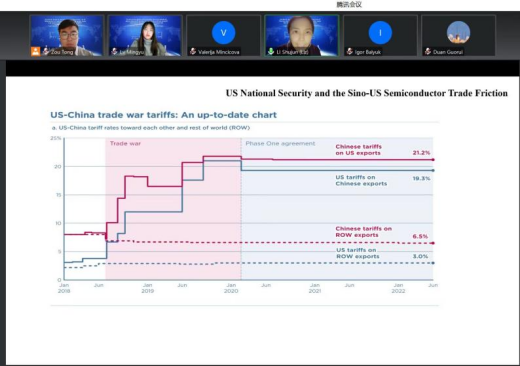 国经贸学院的李淑俊教授发表了题为“National Security, the Sino-US Semiconductor Trade Friction”(国家安全与中美半导体贸易摩擦)的报告。李教授通过经典经济学理论模型和供需理论对美国在半导体贸易领域试图控制双边贸易的原因进行实证分析发现,美国及其盟友在半导体产业的上游和中游环节具有绝对优势,而中国仅在下游环节具有相对优势。因此,美国调整全球半导体供应链和中美半导体贸易摩擦是基于非经济原因,符合美国政府解释的国家安全理念。