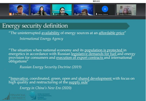 首先来自财政金融大学的Valeria Sergeevna教授做了主题为“Mutually beneficial dialogue: energy security of China and Russia”(互利对话:中俄能源安全)的报告。她在报告中指出,根据世界能源市场的主要结构显示了俄罗斯和中国可以满足的需求。在分析两国的能源安全概念时,列举了在石油、天然气、煤炭、核能和可再生能源贸易、投资、科学研究方面的主要合作方向。结果将表明,俄罗斯和中国在能源安全领域的合作将有助于实现两国的目标,并促进区域性经贸的发展。