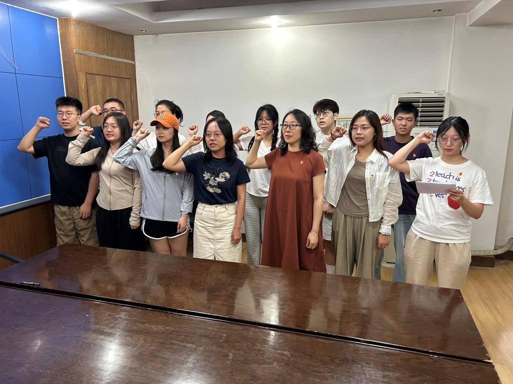 坚守初心,锤炼党性。7.1日支部党员在王斐斐书记的带领下集体学习了《求是》杂志第13期发表的中共中央总书记、国家主席、中央军委主席习近平的《新时代新征程中国共产党的使命任务》。王斐斐书记说习近平总书记在党的二十大报告中,基于对国际国内形势、战略机遇和风险挑战的科学分析,郑重宣示了新时代新征程党的使命任务,集中彰显了党的政治品格,科学回应了时代发展要求,深刻揭示了中国发展逻辑。作为一名党员,我们要深刻把握新时代新征程上自己肩负的使命任务,积极投身中国式现代化建设,在科技创新、乡村振兴、绿色发展、社会服务等各领域各方面工作中争当排头兵和生力军,展现青春的朝气锐气。随后,研究生党支部部分党员高举右拳,重温入党誓词。重温入党誓词,是希望同志们无论未来身处何方,有何境遇,都要时刻牢记自己是一名共产党员,都要坚定初心和使命。响亮的誓言响起,同志们胸前的党徽在党旗的映照下熠熠生辉。
